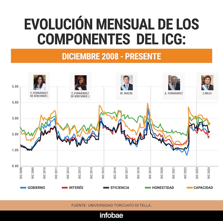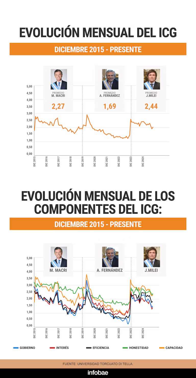 En términos generales, el promedio del ICG durante los primeros 22 meses del gobierno de Milei se ubica en 2,45 puntos, levemente inferior al promedio de los primeros 22 meses de Macri (2,57) y superior al del mismo período del mandato de Fernández (2,17).