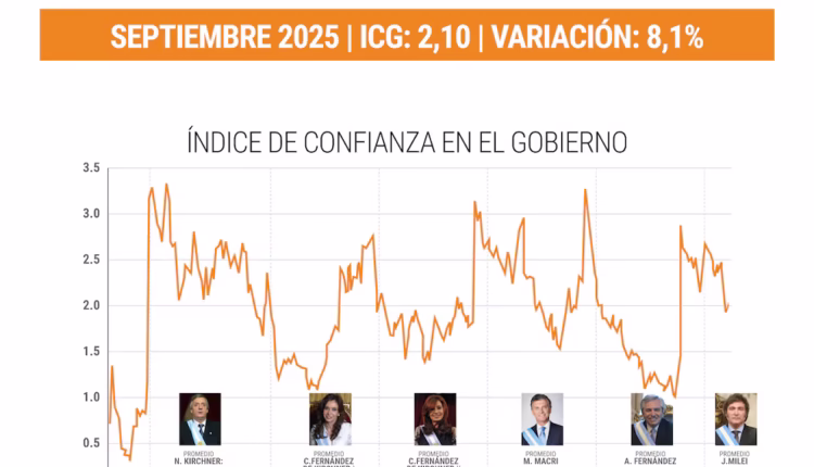 Luego de dos meses consecutivos de caída, el Índice de Confianza en el Gobierno (ICG) elaborado por la Universidad Torcuato Di Tella registró en octubre de 2025 un repunte del 8,1% en comparación con septiembre, al alcanzar los 2,10 puntos en una escala de 0 a 5. El dato, difundido este lunes por la Escuela de Gobierno de esa casa de estudios, muestra una recuperación moderada en la percepción pública sobre la gestión del presidente Javier Milei, aunque el indicador aún se mantiene por debajo del promedio registrado durante su administración.