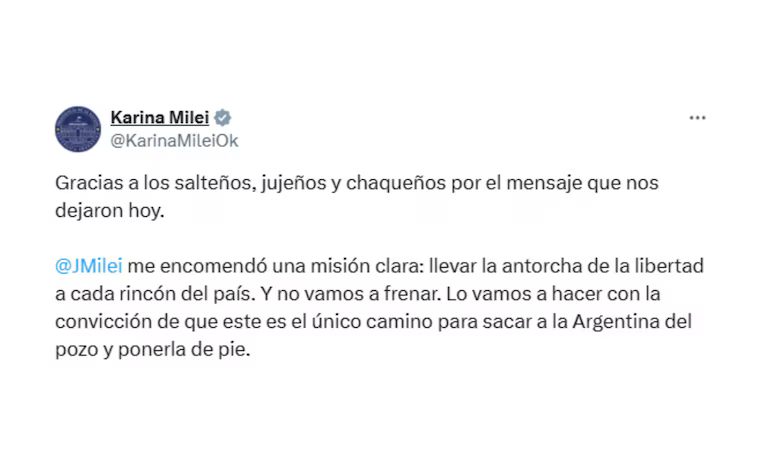 “Gracias a los salteños, jujeños y chaqueños por el mensaje que nos dejaron hoy“, comenzó diciendo Karina. Además, agregó: ”Javier Milei me encomendó una misión clara: llevar la antorcha de la libertad a cada rincón del país. Y no vamos a frenar. Lo vamos a hacer con la convicción de que este es el único camino para sacar a la Argentina del pozo y ponerla de pie“.