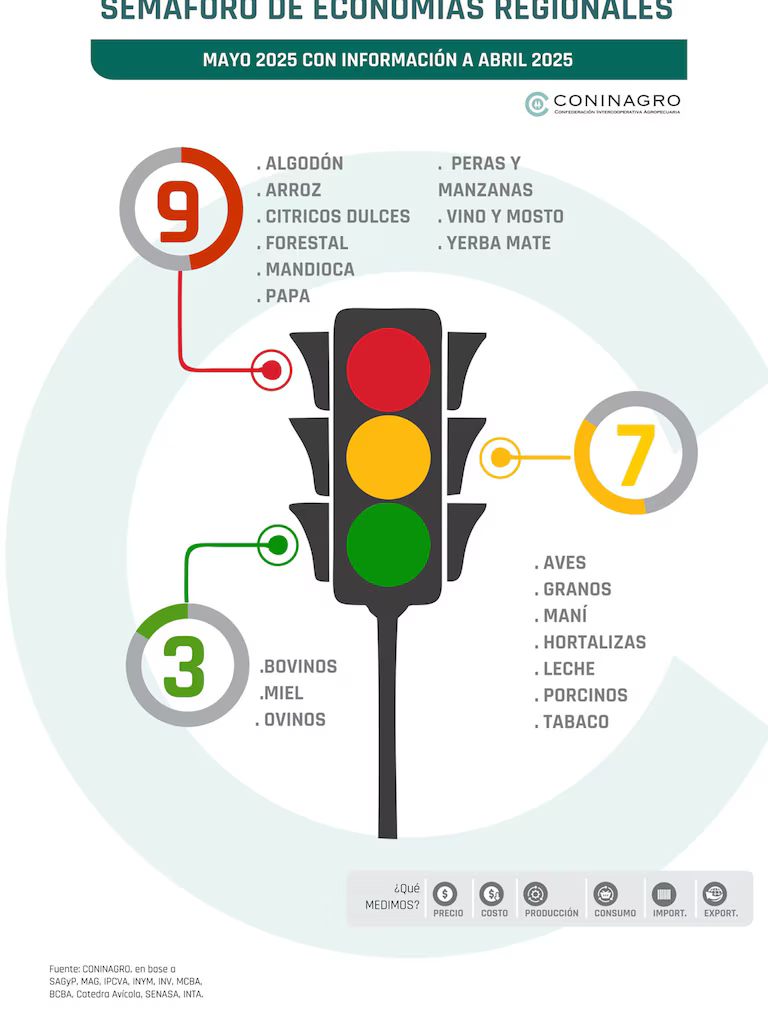 En el informe se observa que varias economías regionales llevan 12 meses consecutivos en negativo, ya que sus variables no mejoran, o en muchos casos empeoran (es el caso del vino y mosto y la yerba mate), y algunas siguen mostrando síntomas de advertencia, sobre todo por un retraso en sus precios respecto a la inflación y a los costos, como es el caso de aves, granos, leche, entre otras.