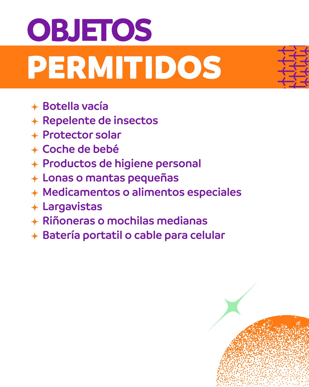Entre los objetos permitidos se encuentran aquellos de uso personal que contribuyen a la comodidad y bienestar de los asistentes. Entre ellos se incluyen botellas vacías, ya que habrá puestos de hidratación distribuidos en todo el predio; repelente de insectos, protector solar, coches de bebé, productos de higiene personal, lonas o mantas pequeñas, medicamentos o alimentos especiales para quienes lo necesiten, largavistas, riñoneras o mochilas medianas, y baterías portátiles o cables para cargar el celular. Llevar únicamente estos elementos permitirá que el público disfrute de la fiesta sin inconvenientes.