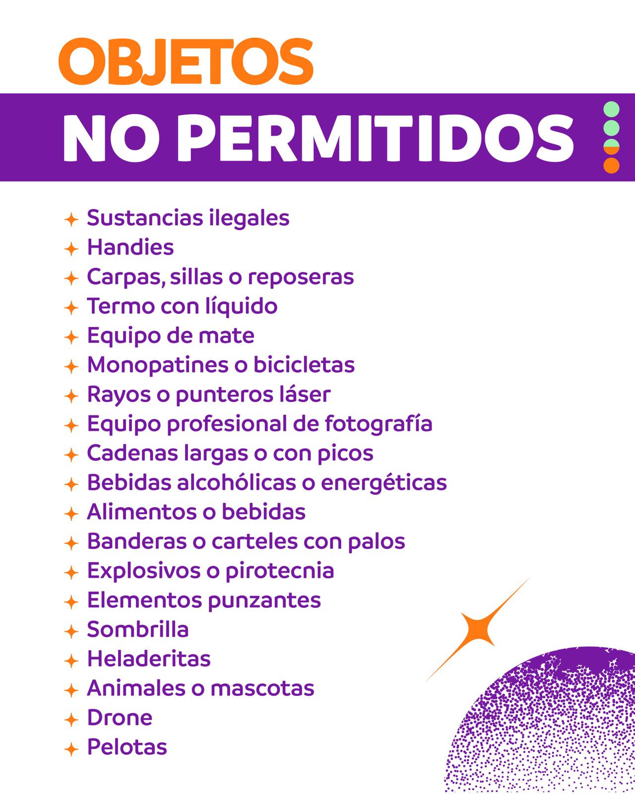 Por otro lado, hay una serie de objetos prohibidos que no podrán ingresar al predio bajo ninguna circunstancia. Entre ellos se incluyen sustancias ilegales, handies, carpas, sillas o reposeras, termos con líquido, equipo de mate, monopatines, bicicletas, rayos láser, equipo profesional de fotografía, cadenas largas o con picos, bebidas alcohólicas o energéticas, alimentos o bebidas externas, banderas con palos, pirotecnia, elementos punzantes, sombrillas, heladeritas, animales, drones y pelotas. Estos objetos representan riesgos para la seguridad y pueden interferir con el disfrute del evento.