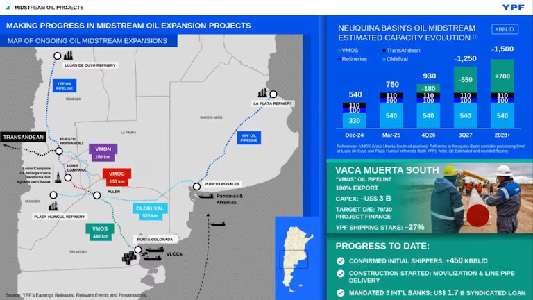 En la industria local avanzan en proyectos para que el salto en la producción de shale oil tenga asociada una infraestructura adecuada para la exportación. Es el caso de la iniciativa “Vaca Muerta Sur” (Vmos) que encabeza YPF para construir la mayor obra de infraestructura de transporte de petróleo de las últimas dos décadas en la Argentina. Las socias confirmadas de la petrolera estatal son Vista Oil & Gas, PAE (Pan American Energy), Pampa Energía, Shell, Chevron y Pluspetrol, quienes reservarán un espacio en la capacidad de transporte del oleoducto.