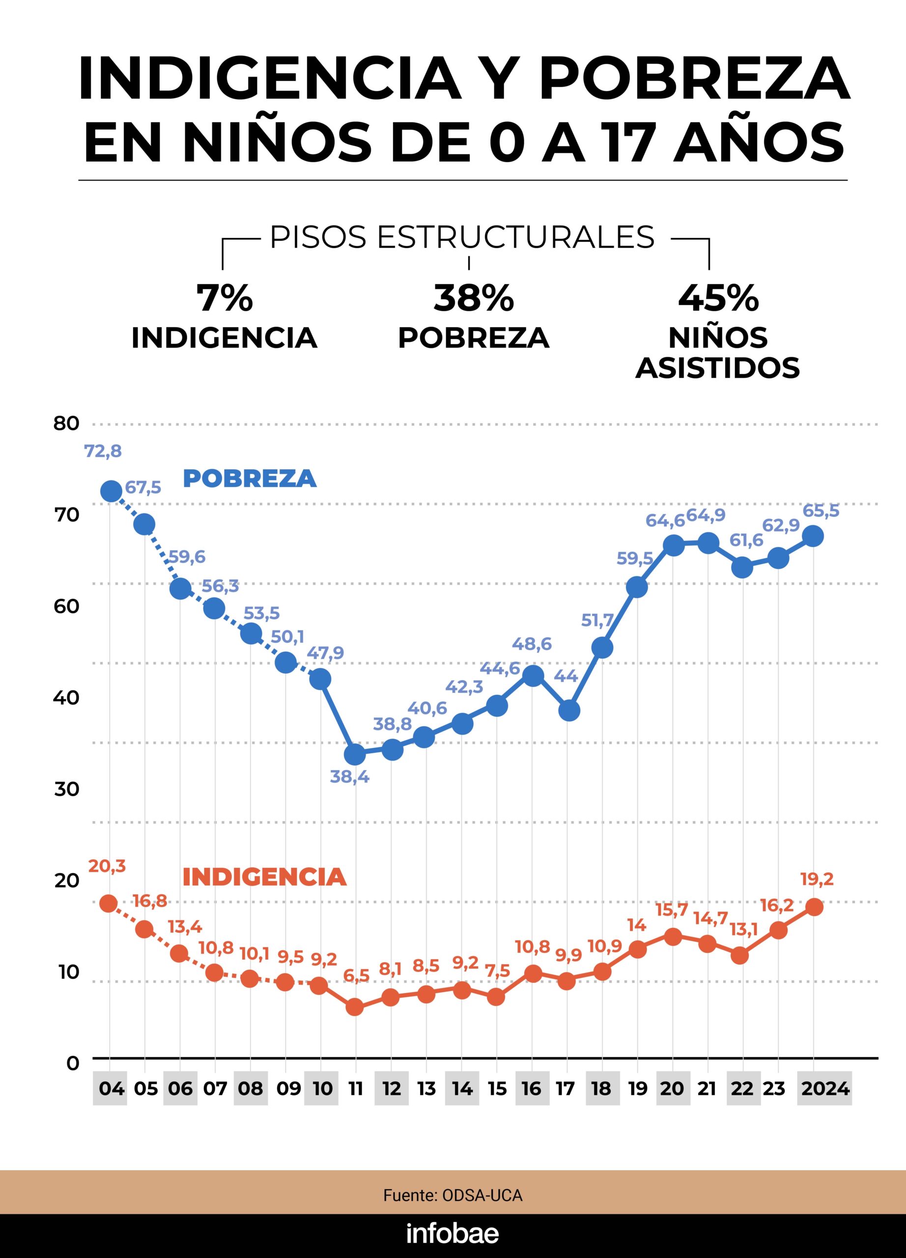 Por otra parte, según las estimaciones de la UCA, la pobreza entre los niños menores de 18 años ascendió a 65,5%, mientras que en 2023 era de 62,9 por ciento. La indigencia en este segmento pasó de 16,2% el año pasado a 19,2% en el tercer trimestre de 2024.