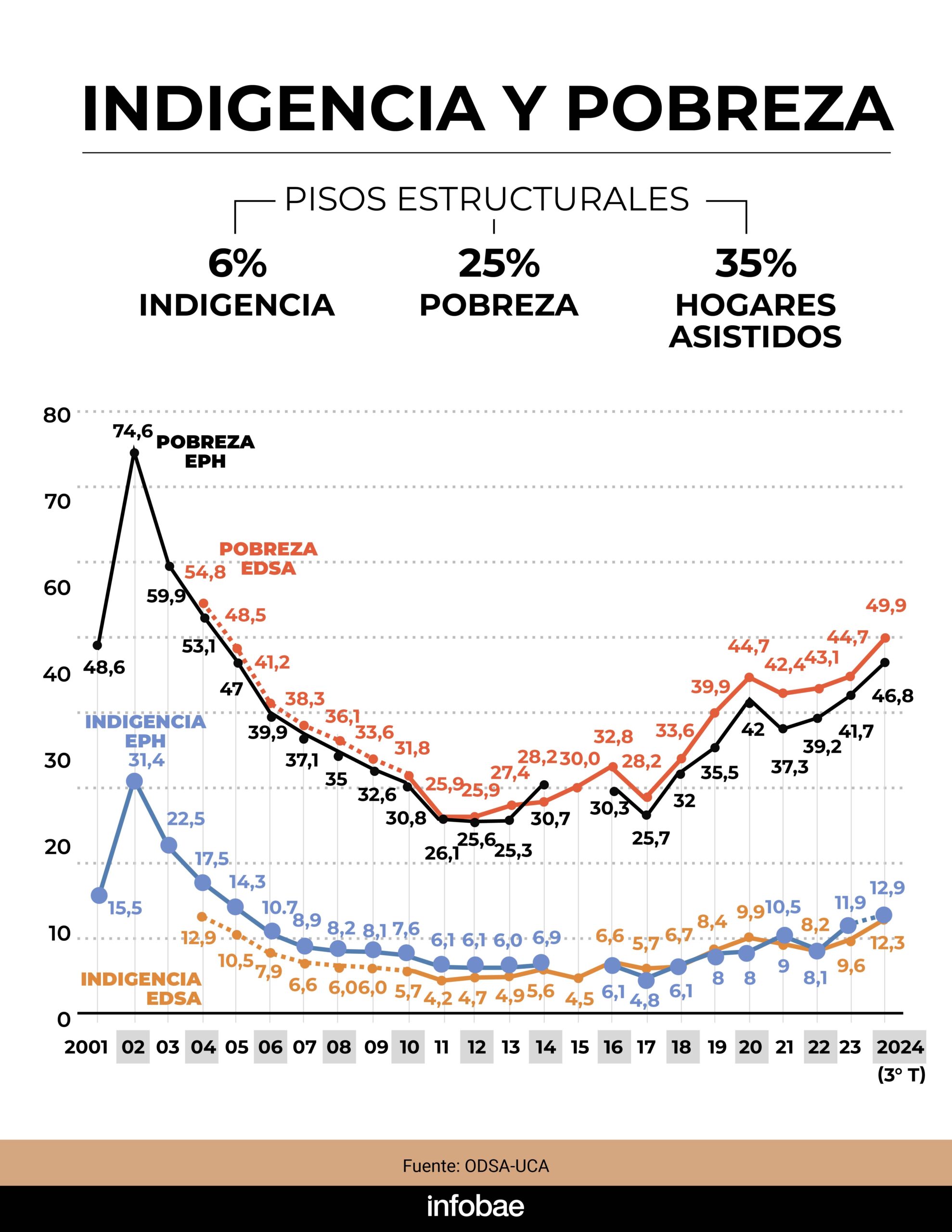 La pobreza alcanzó al 49,9% de la población y la indigencia al 12,3% en el tercer trimestre, según estimaciones del Observatorio de la Deuda Social Argentina de la Universidad Católica Argentina (ODSA-UCA). Estas cifras representan una baja frente al 51% y 15,8% registrados por el Indec en el segundo trimestre, respectivamente. No obstante, son los valores más elevados desde 2004.