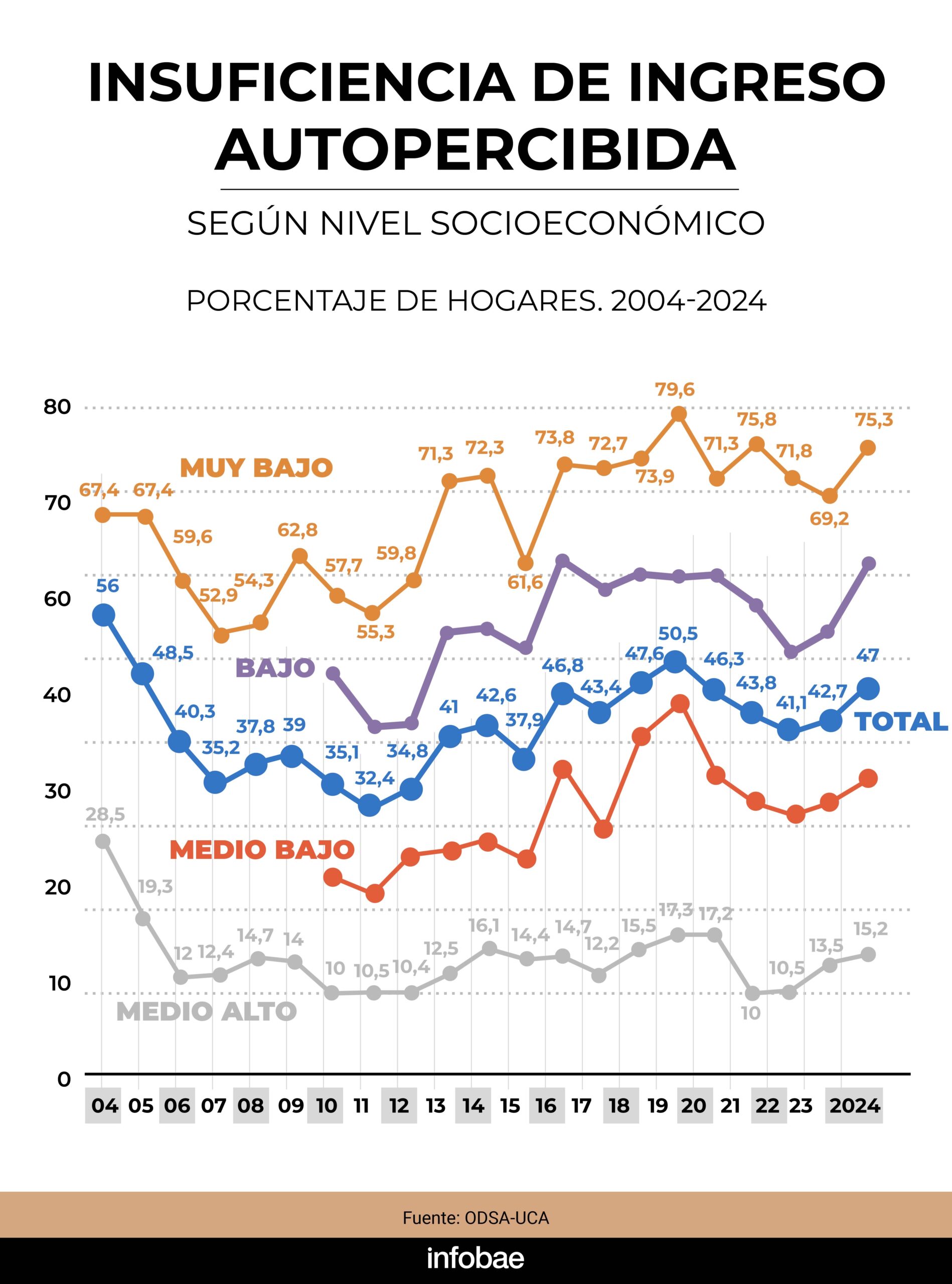 En tanto, el 47% de la población siente que sus ingresos son insuficientes, mostrando una suba en todos los niveles socioeconómicos en relación a 2023. “La situación actual se autopercibe menos grave que durante la pandemia, a la vez que más grave post crisis 2001-2002”, sostuvo el observatorio. Asimismo, disminuyó la cantidad de argentinos que pueden ahorrar, pasando de 11,1% en 2023 a 9,1% en promedio este año.