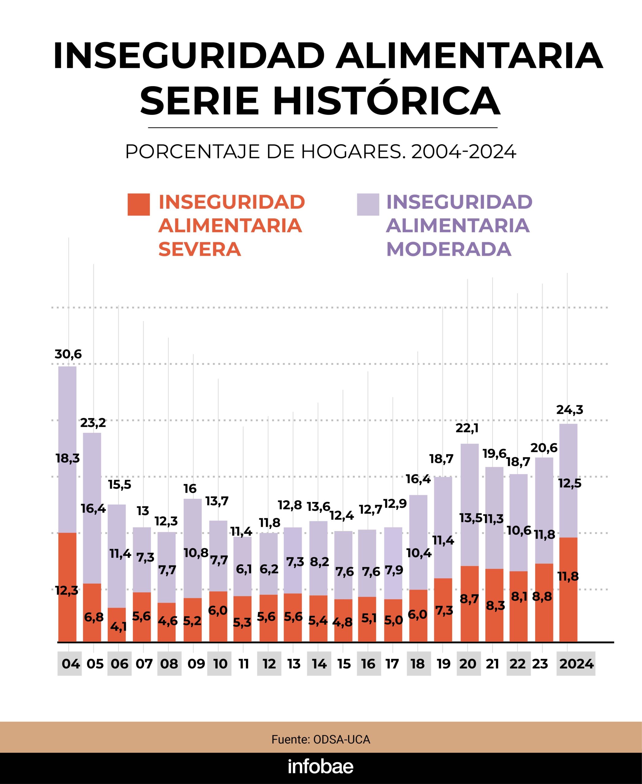 “Actualmente, 2 de cada 10 niños viven en la pobreza extrema. En materia de infancia, los niveles actuales de indigencia y pobreza se acercan a los más altos de la crisis de 2002. Esto implica una fuerte pérdida de capital humano y una desinversión intergeneracional”, precisó el ODSA en su informe y agregó que desde 2022 se observa un incremento de la pobreza infantil en los estratos medios.