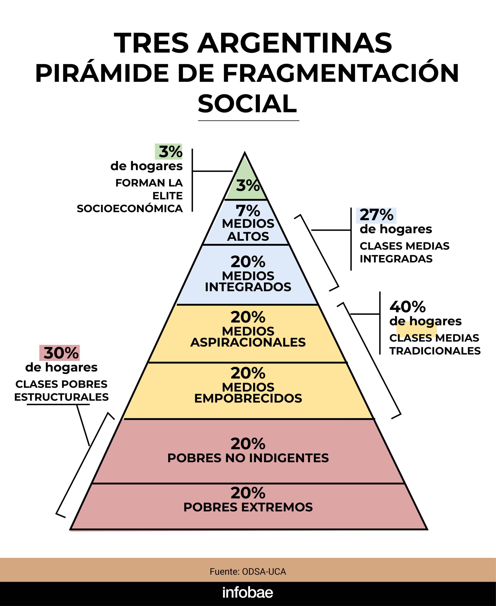 En este contexto, el ODSA señala que hay tres Argentinas: el 3% de los hogares pertenecen a la elite económica, 27% a clases medias integradas, 40% a clases medias tradicionales y 30% a clases pobres estructurales.