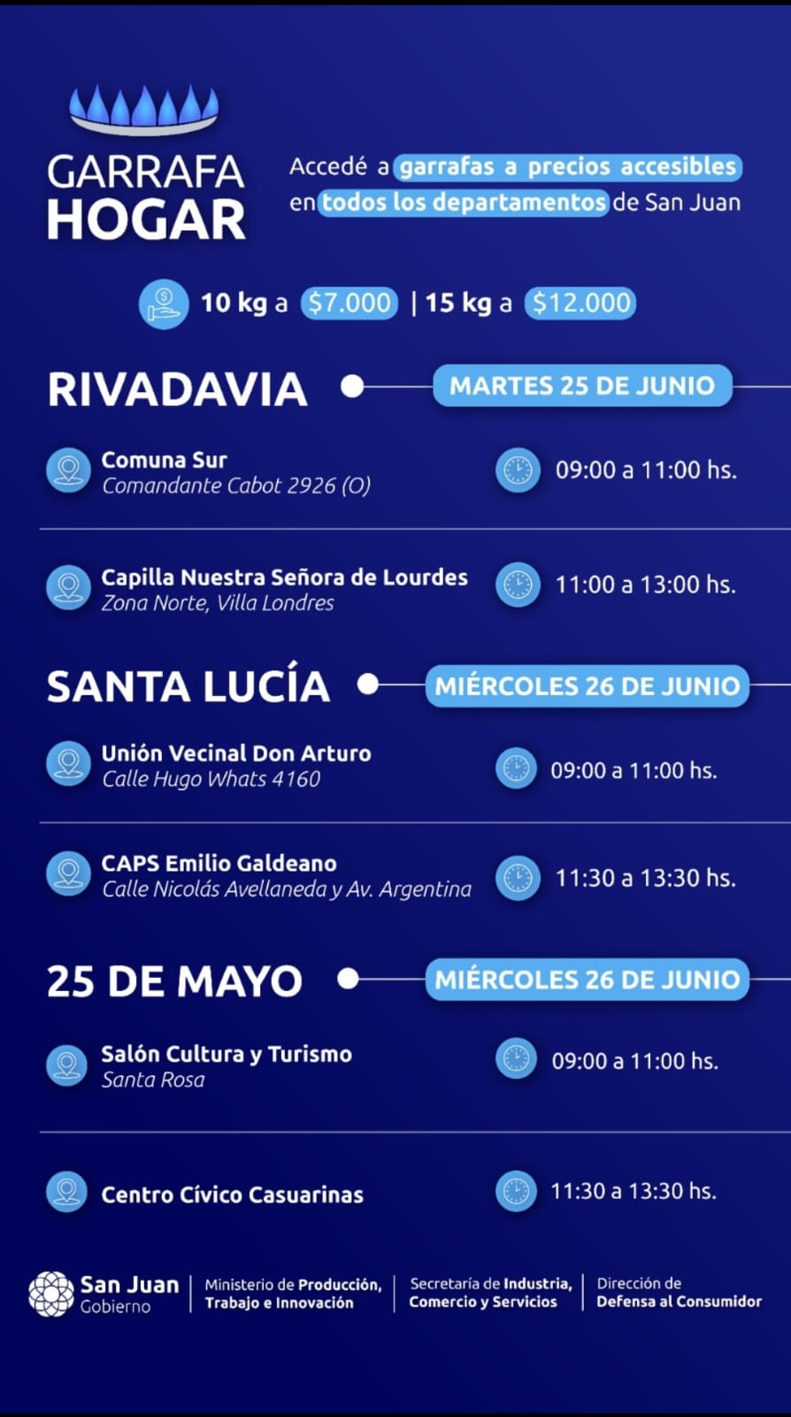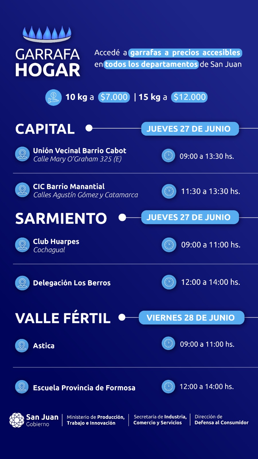 El Ministerio de Producción, Trabajo e Innovación, a través de la Dirección de Defensa al Consumidor; llevará las unidades de 15 kg y 10 kg -a menos del 50% del valor de mercado a distintas localidades de Iglesia, Calingasta, Chimbas, Rivadavia, 25 de Mayo, Santa Lucía, Capital, Sarmiento y Valle Fértil.