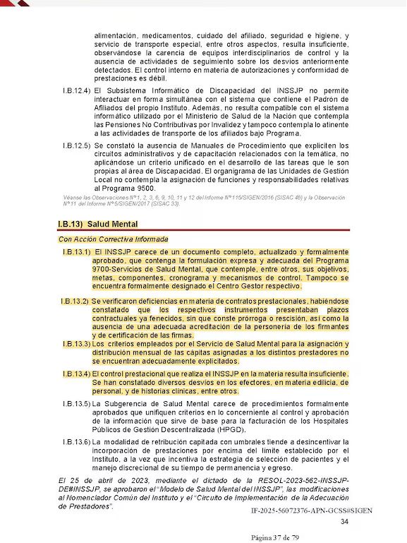 Según revelan los peritos de la SIGEN la obra social de jubilados y pensionados “carece de un documento completo, actualizado y formalmente aprobado, que contenga la formulación expresa y adecuada del Programa 9700-Servicios de Salud Mental, que contemple, entre otros, sus objetivos, metas, componentes, cronograma y mecanismos de control.