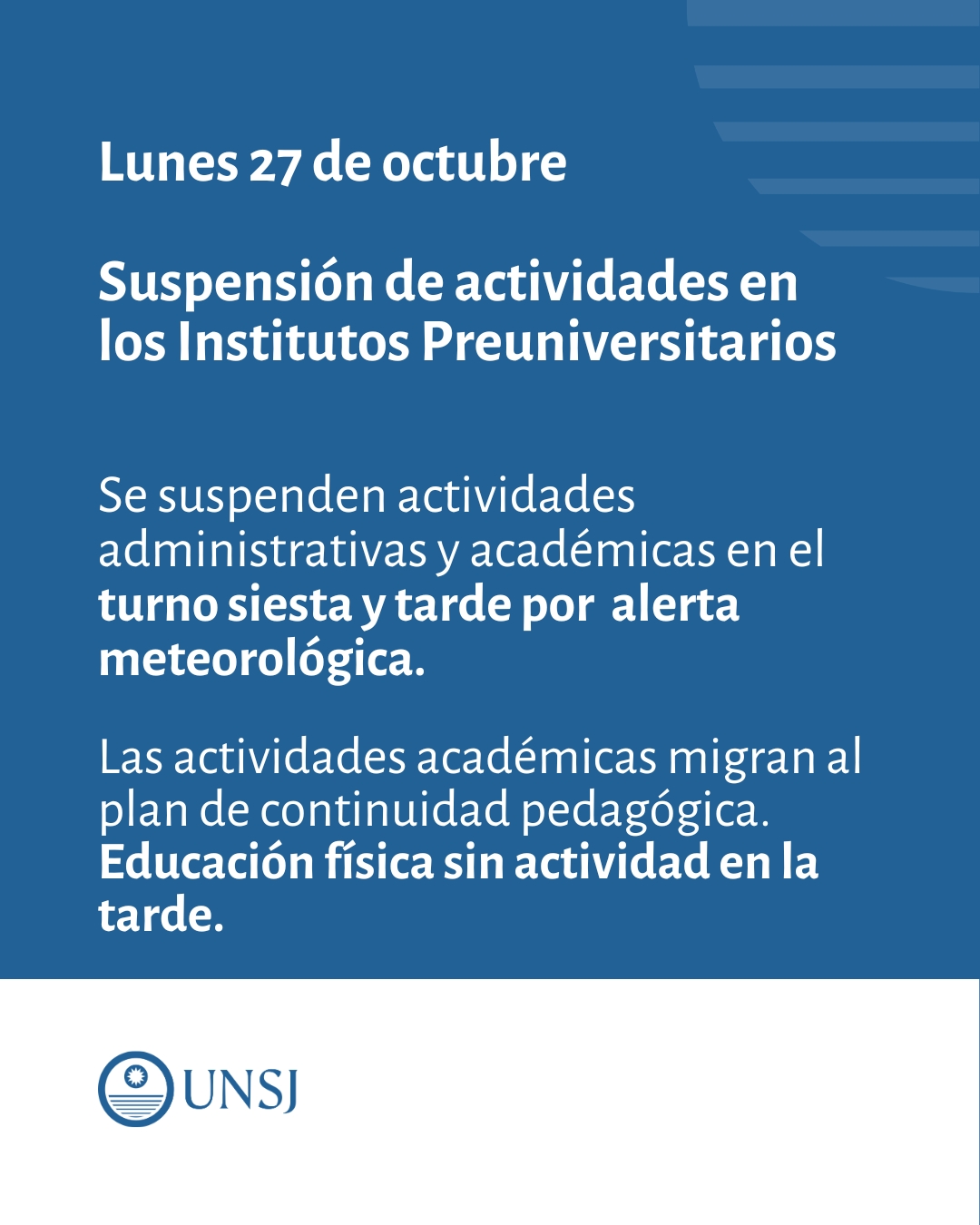 La Universidad Nacional de San Juan (UNSJ) comunicó que la medida abarca todas las actividades académicas y administrativas, incluyendo educación física, que tampoco se dictará durante la tarde. Las clases migrarán al plan de continuidad pedagógica para garantizar la actividad educativa a pesar de la suspensión presencial.