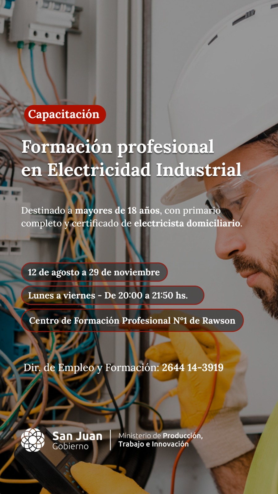 Se llevará a cabo un curso para formarse como electricista industrial. La formación está destinada a mayores de 18 años que cuenten con Primario Completo y con certificado válido que acredite que puede obtener matrícula como electricista domiciliario o que ya haya realizado la formación profesional correspondiente a dicho oficio.
