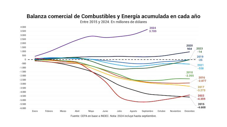 El Centro de Economía Política (CEPA) destacó que en los primeros nueve meses del 2024 se registró un superávit energético de USD 3.709 millones, es decir, ingresaron muchas más divisas de las que salieron. Desde 2015 que el saldo no había sido positivo, con la excepción de la pandemia de Covid-19. Las proyecciones privadas arrojan que 2024 finalizaría con un superávit de USD 5.000 millones y en el Gobierno apuestan a que puede acercarse a los USD 10.000 millones en 2025 gracias al desarrollo de Vaca Muerta.