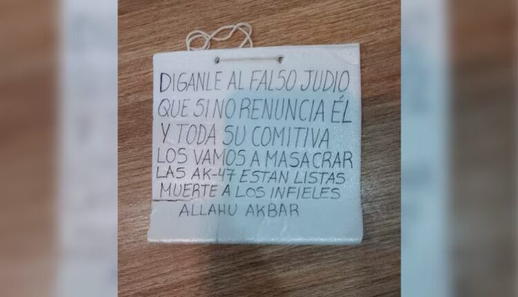 “Díganle al falso judío que si no renuncia, él y toda su comitiva, los vamos a masacrar. Las AK 47 (un fusil de guerra de la era soviética) están listas. Muerte a los infieles. Allahu Akbar (Alá es Grande)”, dice el escrito encontrado en la sede partidaria de La Libertad Avanza, localizada en calle 25 de Mayo al 1600.