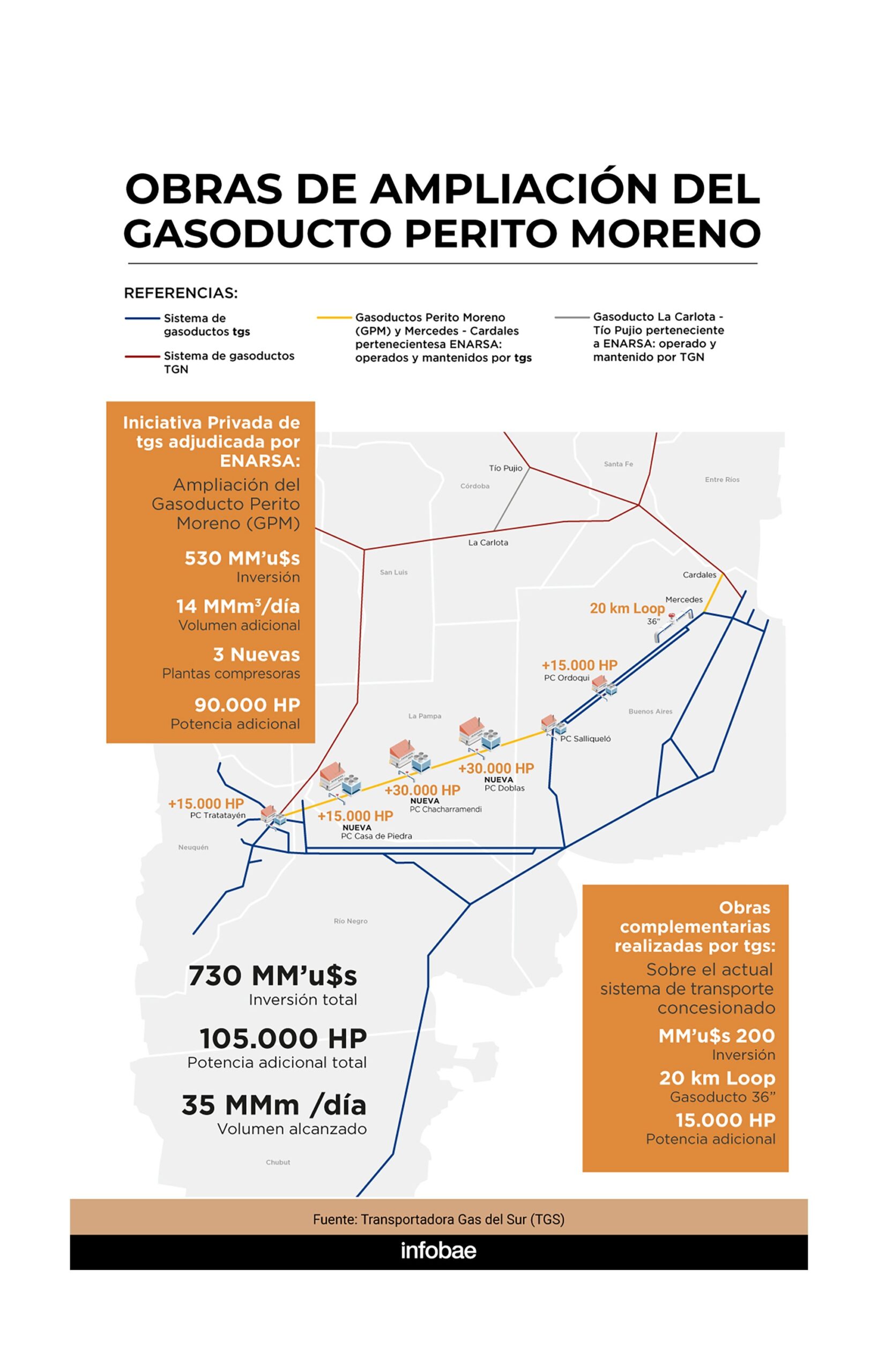 La primera etapa del plan contempla la instalación de tres nuevas plantas compresoras y un equipo compresor adicional en la planta existente en Tratayén. Con estas mejoras, el Gasoducto Perito Moreno elevará su potencia total a 90.000 HP y pasará de transportar 21 MMm³/día a 35 MMm³/día en el invierno de 2026, sumando así 14 MMm³/día de capacidad adicional. Conforme a los términos licitatorios, TGS también podrá optar por realizar una obra de mayor escala que habilite el despacho de otros 6 MMm³/día si la demanda del mercado así lo requiere.