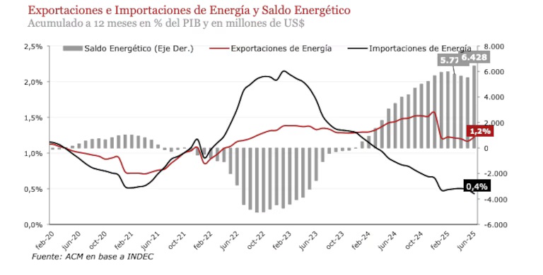 En el primer semestre, la balanza energética arrojó un saldo positivo de USD 3.176 millones, por sobre los USD 2.788 de saldo negativo del intercambio total de bienes, y cerraría el año con récord anual pese a precios internacionales más bajos