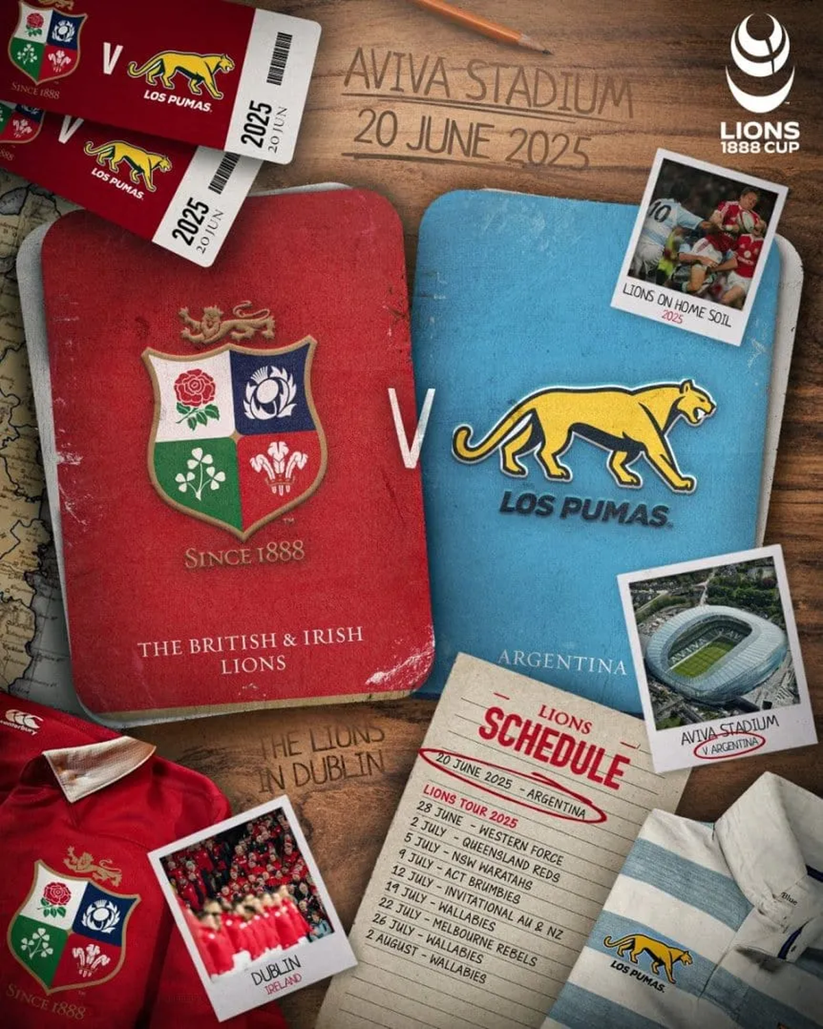 Los Pumas enfrentarán a los British & Irish Lions en el Aviva Stadium de Dublín, Irlanda. El encuentro será el viernes 20 de junio de 2025 por la Lions 1888 Cup. 20 años después, el conjunto de los mejores jugadores de Gales, Escocia, Inglaterra e Irlanda volverá a medirse con el seleccionado argentino. Lo curioso es que será el sexto duelo entre ambos y el equipo albiceleste nunca pudo ganar: cinco derrotas y un empate.