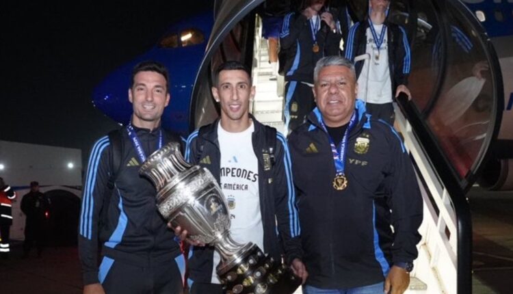 Llegaron cerca de las 22.00 de este lunes. Una de las primeras imágenes que trascendió en el avión, ploteado con la frase “LLEVAMOS CAMPEONES”, fue la de Ángel Di María, quien le puso fin a su exitoso ciclo con la Albiceleste, con la Copa América entre sus brazos. De fondo se lo puede ver a Rodrigo De Paul, el motorcito de la Scaloneta.