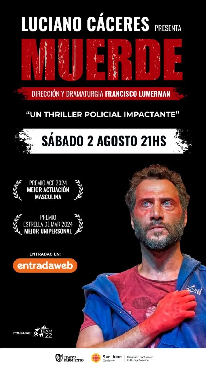 Este sábado 2 de agosto, Luciano Cáceres se presentará en San Juan con Muerde, un unipersonal policial que lo desafía a sostener la obra desde el escenario en completa soledad. La pieza combina suspenso con elementos de otros géneros y representa un nuevo hito en su carrera.