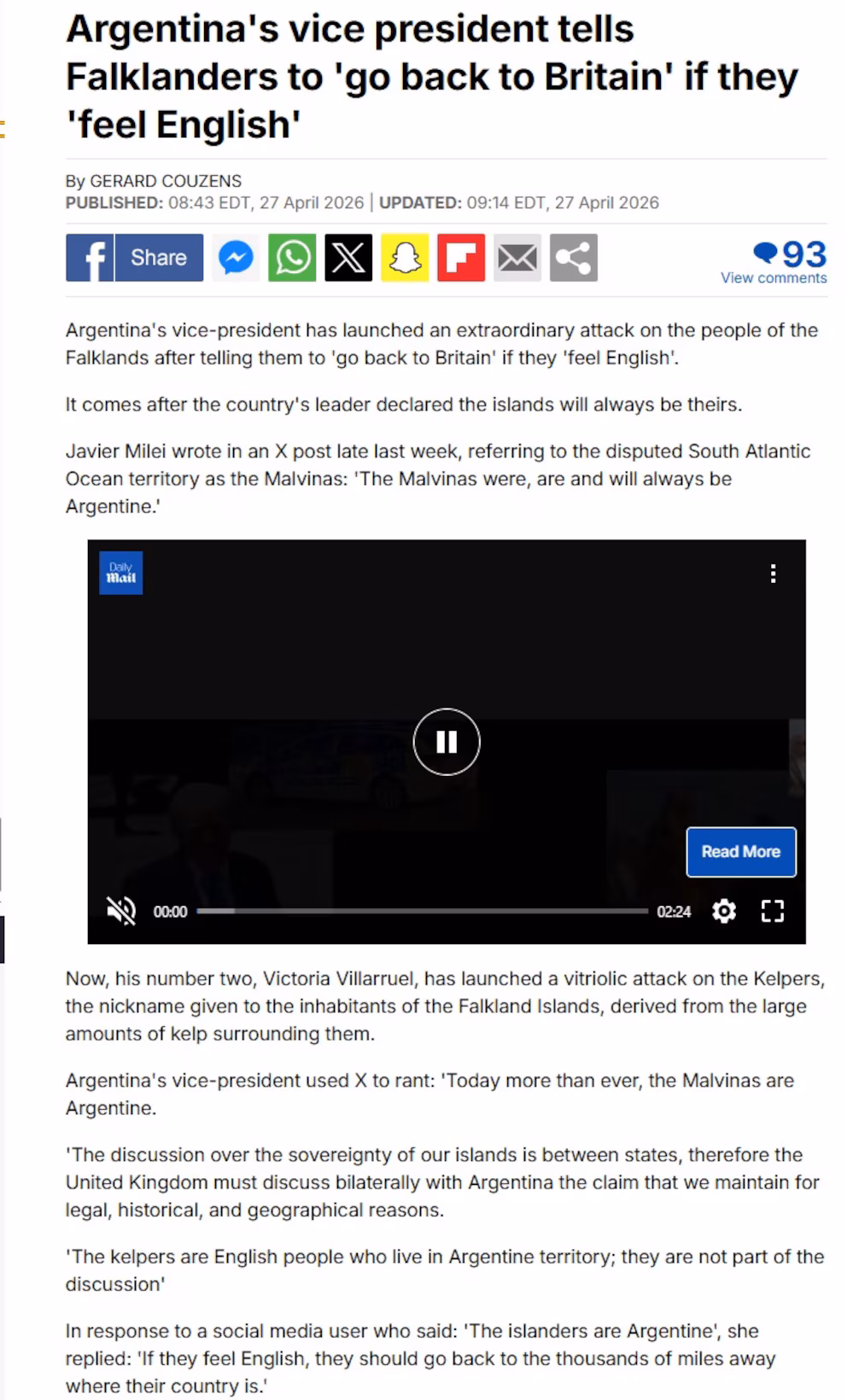 “Hoy más que nunca, las Malvinas son argentinas”, escribió Villarruel en X. “La discusión sobre la soberanía de nuestras islas es entre estados, por lo tanto el Reino Unido debe discutir bilateralmente con Argentina el reclamo que mantenemos por razones legales, históricas y geográficas. Los kelpers son ingleses que viven en territorio argentino; no son parte de la discusión“, añadió la vicepresidenta. En respuesta a un usuario que sostenía que “los isleños son argentinos”, Villarruel replicó: “Si se sienten ingleses, que vuelvan a los miles de kilómetros de distancia donde está su país.”