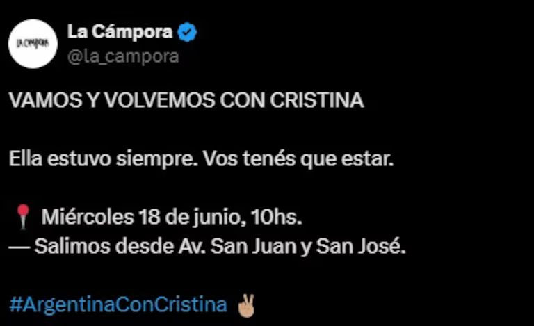 “Argentina con Cristina. Caminamos hasta Comodoro Py y volvemos con ella a su casa”, dice el flyer que difundieron desde el cristinismo, el cual tiene el mismo sentido que hizo La Cámpora: “Vamos y volvemos con Cristina”. Una consigna direccionada implícitamente a los jueces que deben decidir sobre la domiciliaria, aunque cerca de la expresidenta lo describen de otra manera.