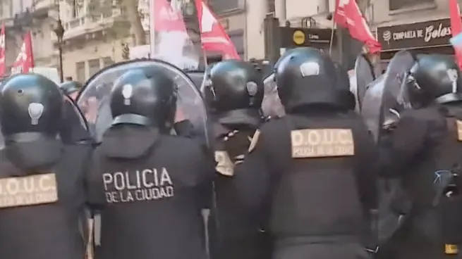 A las 17, la tensión se trasladó al cruce de Avenida de Mayo y 9 de Julio, punto de encuentro de los manifestantes que se disponían a marchar rumbo al Congreso. Allí, la Policía avanzó para obligarlos a replegarse hacia la vereda. Los efectivos lanzaron gases lacrimógenos, avanzaron con escudos y reforzaron el operativo con infantería, móviles policiales, patrullas motorizadas y un carro hidrante. En medio de los incidentes, hubo al menos un detenido.