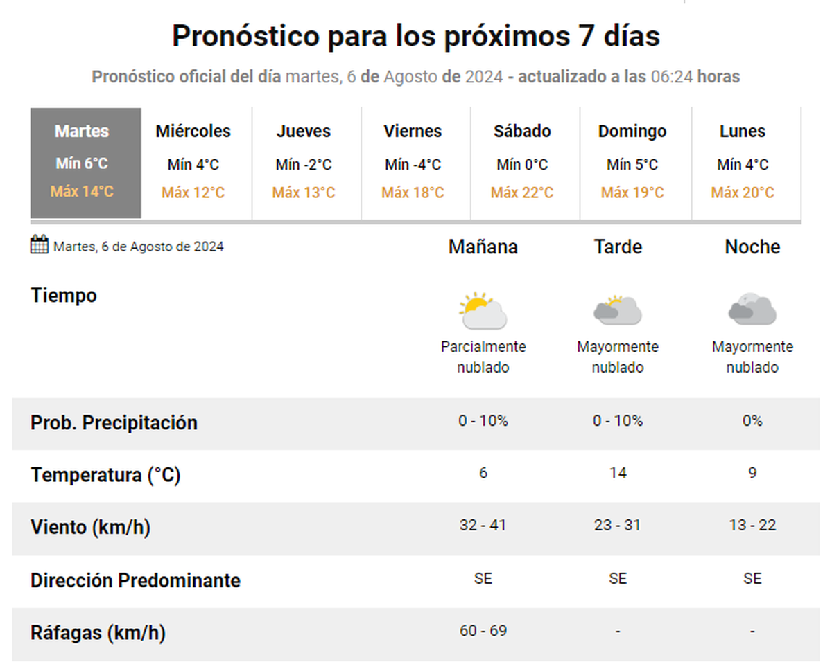 El pronóstico del Servicio Meteorológico indica que las ráfagas más fuertes del viento serán en la mañana, bajando su intensidad entrada la tarde. El viento Sur traerá consigo una notable baja de la temperatura en los próximos días.