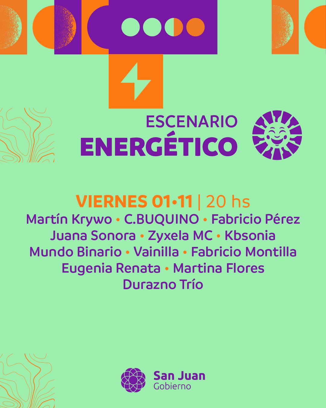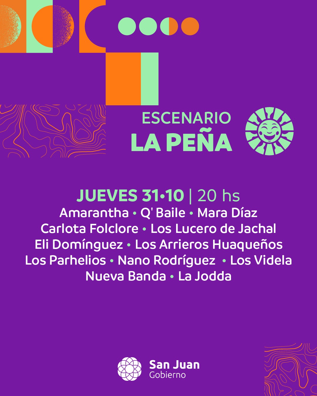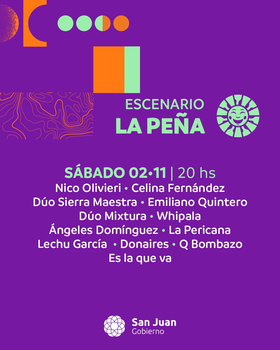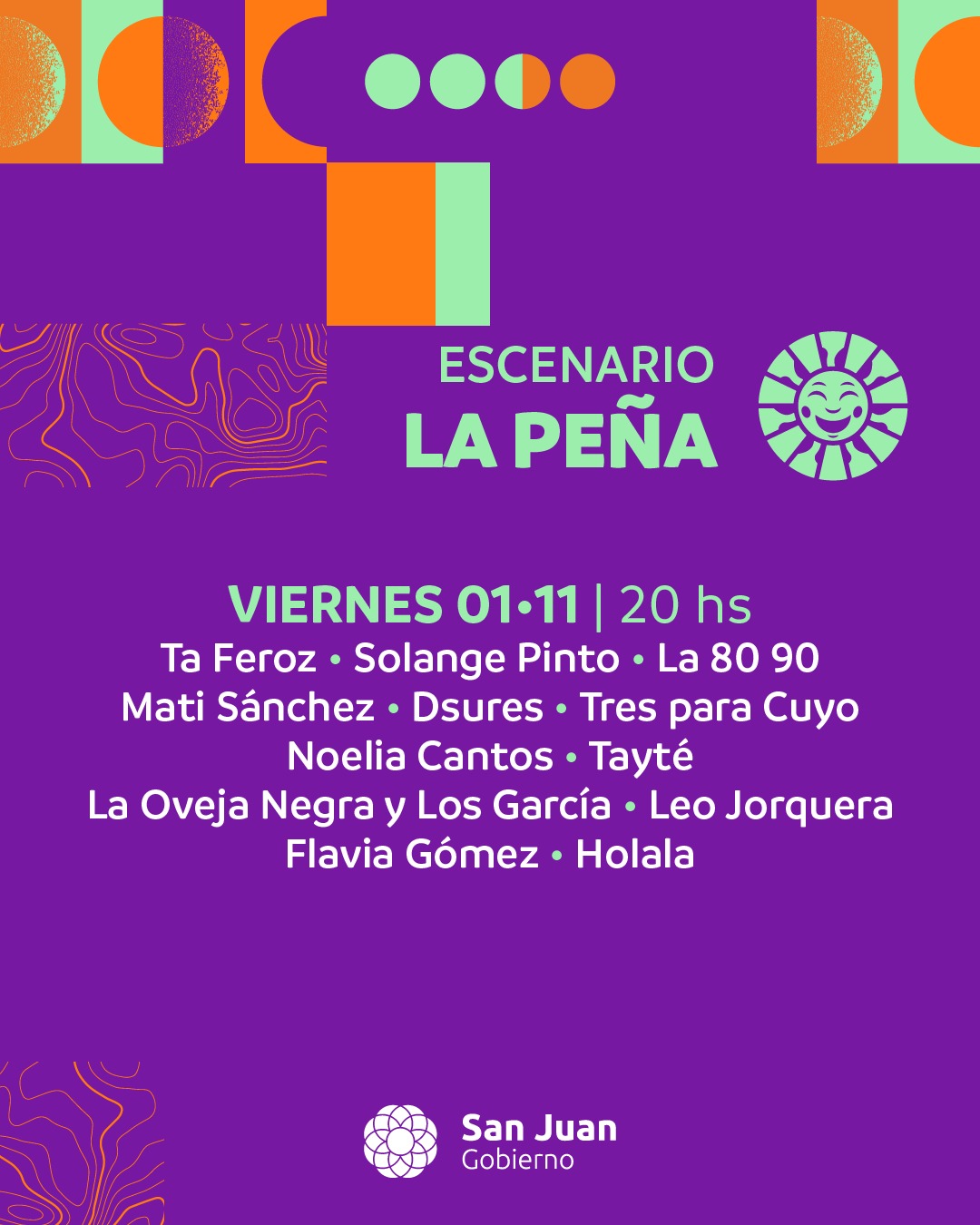 El escenario La Peña estará dedicado al folclore, el cuarteto y la cumbia destacando las raíces y la tradición musical sanjuanina.
