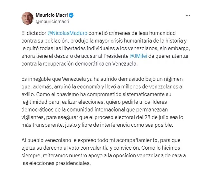 “El dictador Nicolás Maduro cometió crímenes de lesa humanidad contra su población, produjo la mayor crisis humanitaria de la historia y le quitó todas las libertades individuales a los venezolanos, sin embargo, ahora tiene el descaro de acusar al Presidente Javier Milei de querer atentar contra la recuperación democrática en Venezuela”, escribió Macri en su cuenta de X.