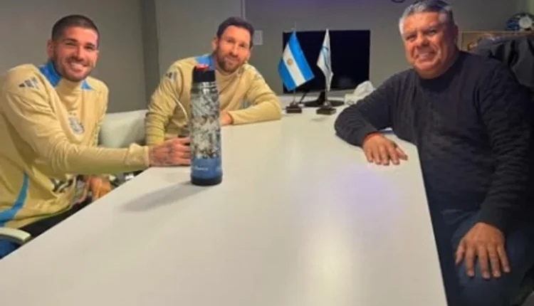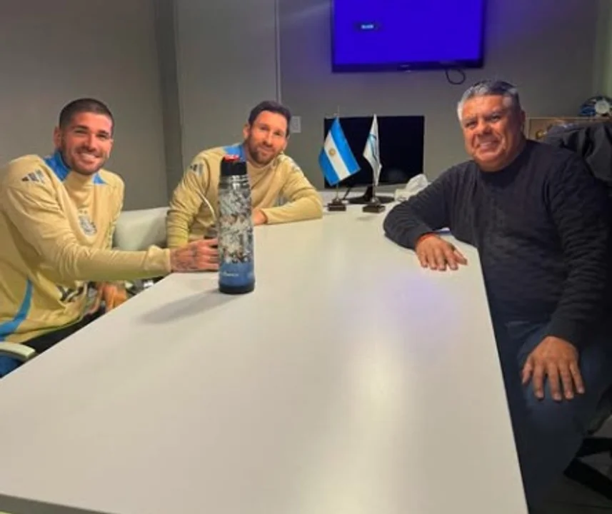 “El mate sagrado, tridente con historia. Familia que se elige”, escribió el presidente de la AFA en su cuenta oficial, junto a una foto en la que los tres se muestran sonrientes, rodeados por los colores de la Selección y con el inseparable termo decorado con los tonos celeste y blanco.