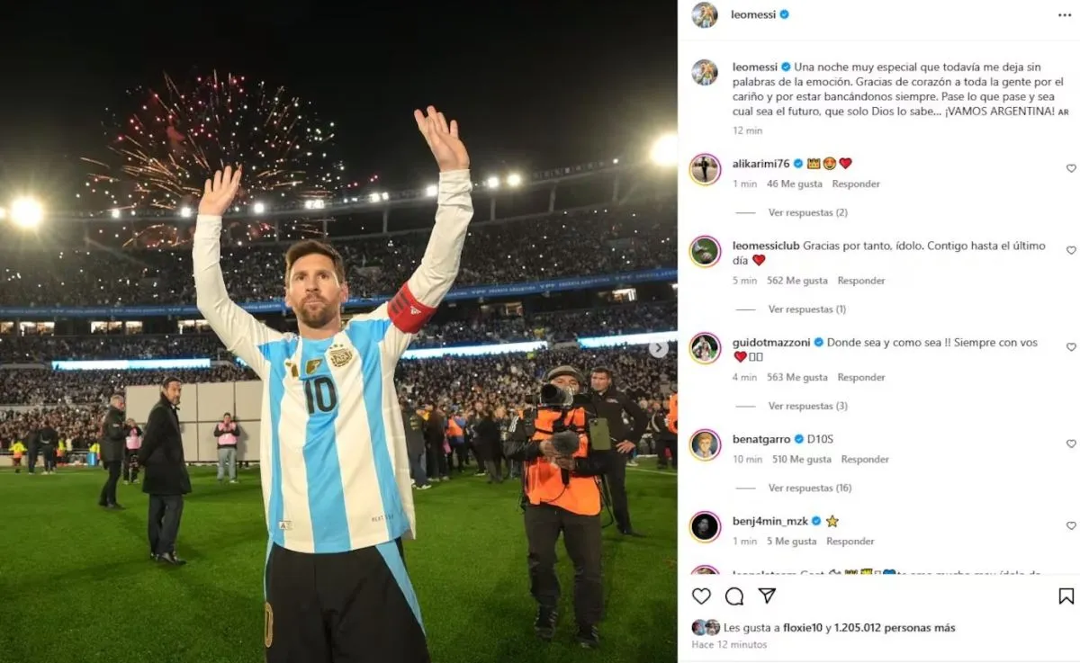 El capitán argentino Lionel Messi subió a la red Instagram un sentido mensaje luego de la goleada frente a Venezuela (3-0) en el Monumental. En sus palabras, agradeció a todos por el cariño y dejó la incertidumbre de lo que pueda llegar a pasar con su futuro en la Selección argentina.