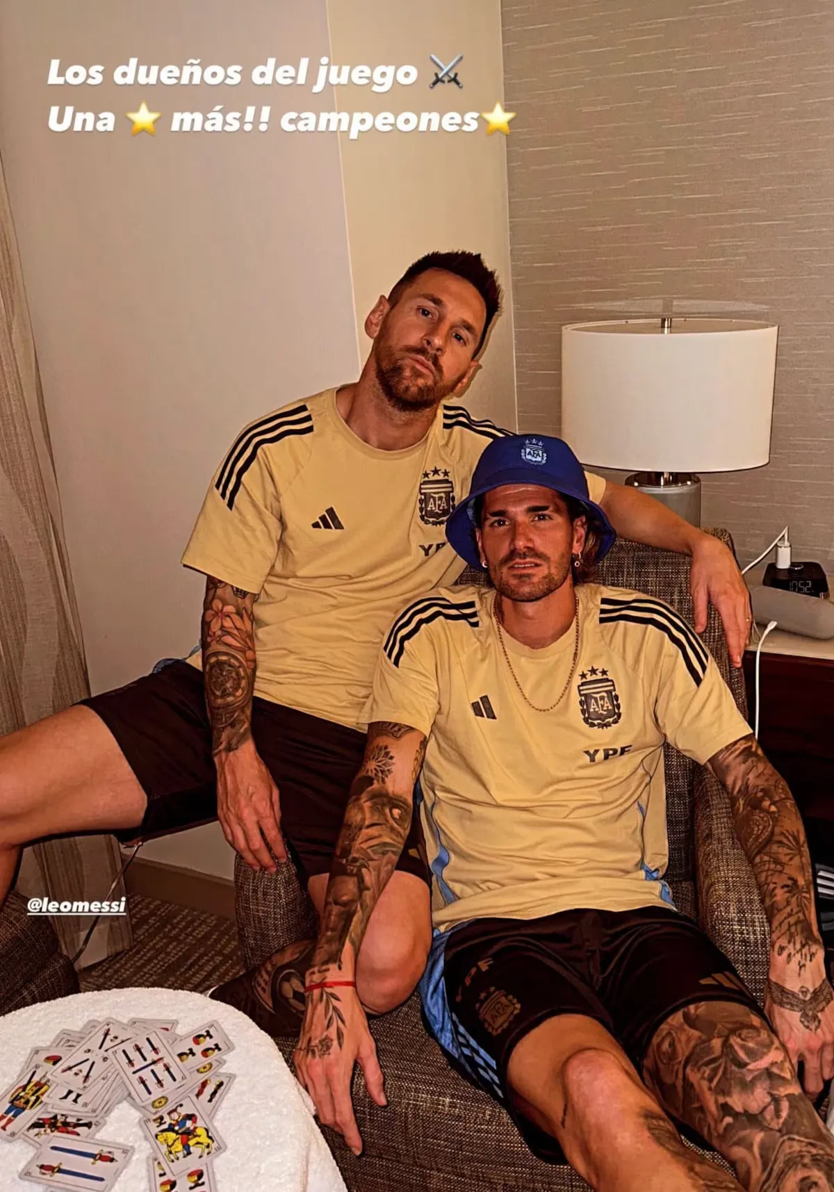 “Los dueños del juego. Una (estrella) más. Campeones”, escribió De Paul sobre una foto en la que se lo ve junto a Lionel Messi, ambos con caras desafiantes tras ganar un torneo de truco. Al costado de ellos se pueden observar las cartas arriba de la mesa tras el campeonato.