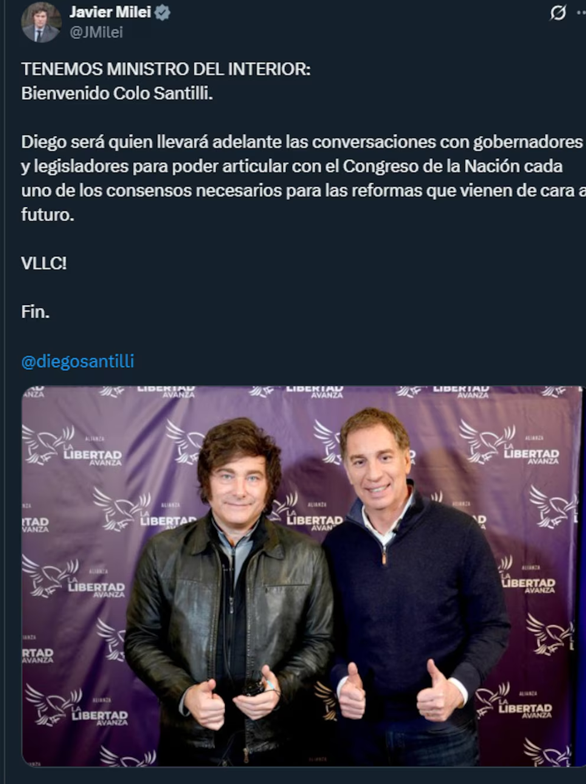 “Tenemos ministro del Interior. Bienvenido Colo Santilli. Diego será quien llevará adelante las conversaciones con gobernadores y legisladores para poder articular con el Congreso de la Nación cada uno de los consensos necesarios para las reformas que vienen de cara al futuro. ¡VLLC (viva la libertad, carajo)! Fin”, escribió el mandatario nacional en su cuenta de X.
