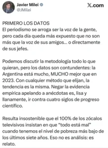 Milei hizo un extenso posteo contra el periodismo y advirtió: “La Argentina está mucho mejor que en 2023”