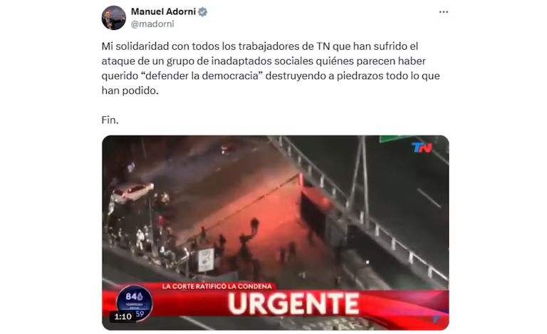 “Mi solidaridad con todos los trabajadores de TN que han sufrido el ataque de un grupo de inadaptados sociales quiénes parecen haber querido “defender la democracia” destruyendo a piedrazos todo lo que han podido. Fin”, escribió Adorni.
