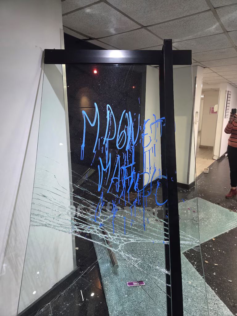 Las cámaras registraron el mobiliario destrozado en un hall del canal. Se pudo observar la destrucción de televisores.