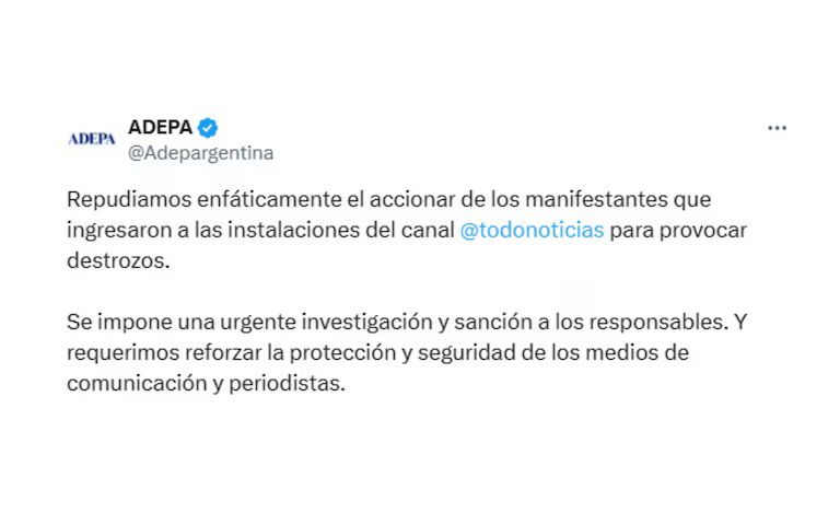 “Repudiamos enfáticamente el accionar de los manifestantes que ingresaron a las instalaciones del canal TN para provocar destrozos”, comenzó el comunicado publicado por ADEPA. Y continuó: “Se impone una urgente investigación y sanción a los responsables. Y requerimos reforzar la protección y seguridad de los medios de comunicación y periodistas”.