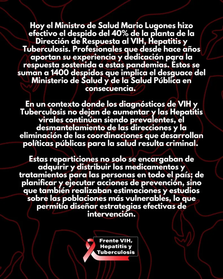 Ante los despidos, desde el Frente Nacional por la Salud de las Personas con VIH, Hepatitis y Tuberculosis advirtieron que esta medida deja sin capacidad al Ministerio para dar respuesta a las enfermedades. En ese sentido, desde la agrupación informaron que, en los últimos tiempos, existe un aumento notorio de los diagnósticos de VIH y Tuberculosis, por lo que “el desmantelamiento de las direcciones y la eliminación de las coordinaciones que desarrollan políticas públicas para la salud resulta criminal“.