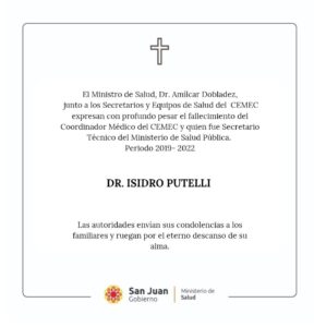 El Ministerio de Salud de la provincia de San Juan confirmó el fallecimiento de Isidro Putelli, reconocido especialista en neumonología y exsecretario técnico de la cartera sanitaria.