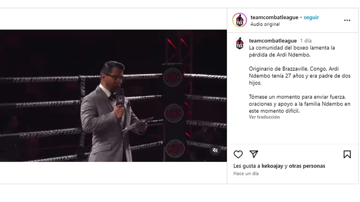 Pero tras pasar más de 20 días internado, se informó que Ndembo había fallecido: “En Viva Promotions lamentamos la pérdida de Ardi Ndembo, un talentoso boxeador congoleño que falleció trágicamente después de nocaut en un partido de la Liga de Combate por Equipo el 5 de abril. Permaneció en coma inducido hasta su muerte prematura. ¡QEPD Ardi Ndembo!”, escribió el gimnasio donde entrenaba en redes sociales. La organización de este certamen también se refirió a lo ocurrido: “La comunidad de boxeo lamenta la pérdida de Ardi Ndembo. Originario de Brazzaville, Congo, Ardi Ndembo era un padre de 27 años de edad y dos hijos. Por favor tomen un momento para enviar su fuerza, oraciones y apoyo a la familia Ndembo en este momento difícil”.