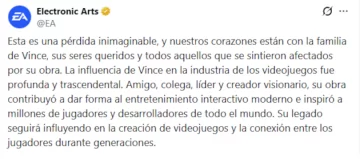 Desde Electronic Arts, compañía con la que Zampella trabajó en los últimos años, emitieron un comunicado expresando su pesar: “Esta es una pérdida inimaginable y nuestros corazones están con la familia de Vince, sus seres queridos y todos aquellos que se sintieron marcados por su obra”.