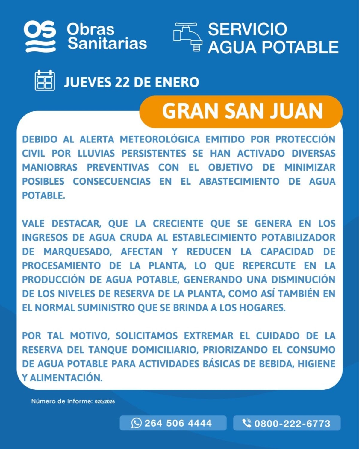 Tras las lluvias registradas en San Juan durante la tarde del jueves 22 de enero, Obras Sanitarias (OS) informó que se verá afectado el normal suministro de agua potable en distintos sectores del Gran San Juan.