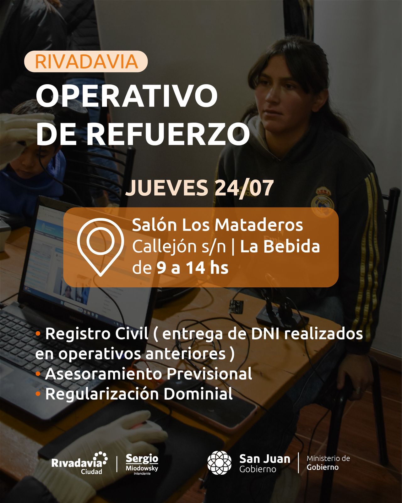 El Ministerio de Gobierno, a través del Registro del Estado Civil y Capacidad de las Personas, dependiente de la Secretaría de Gobierno, Justicia y DDHH. llevará adelane el operativo en callejón S/N, Salón Los Maderos, en la localidad de La Bebida, con el objetivo de facilitar gestiones esenciales para los vecinos. Durante la jornada, se podrán realizar trámites para obtener el Documento Nacional de Identidad, acceder a la regularización dominial y recibir asesoramiento previsional.