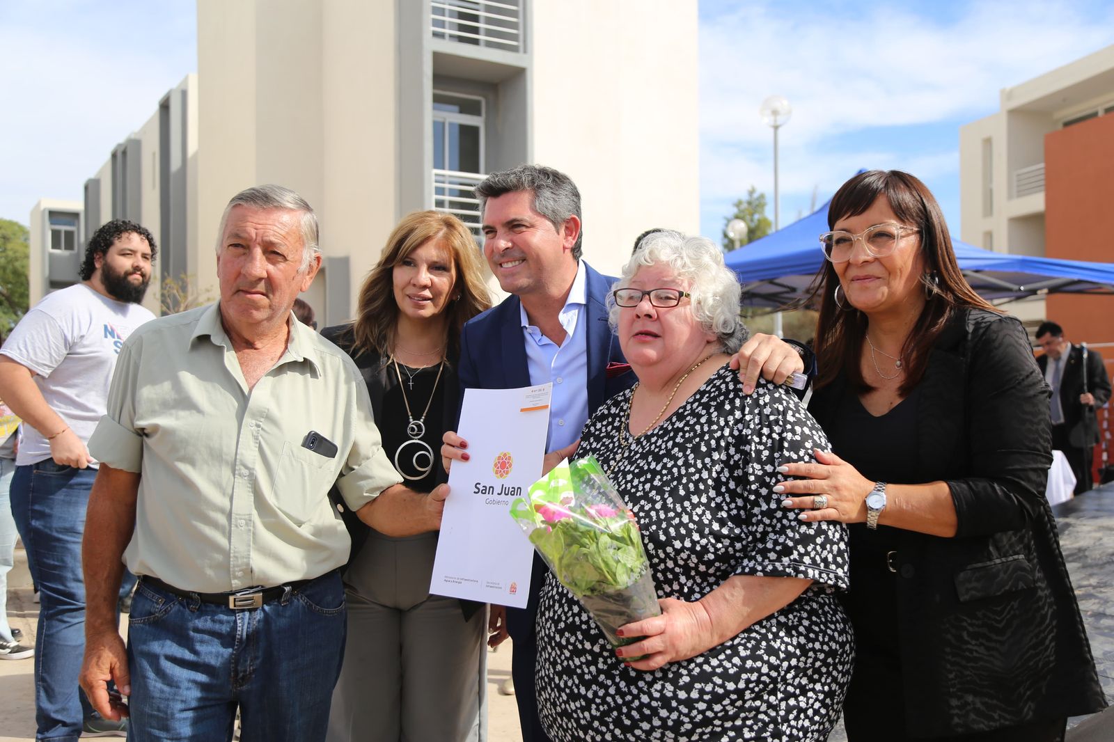 Acompañaron al mandatario la intendenta de Chimbas, Daniela Rodríguez; diputada Nacional, Ángeles Moreno, ministro de Infraestructura, Agua y Energía, Fernando Perea, directora del IPV, Elina Peralta, demás autoridades provinciales y departamentales.
