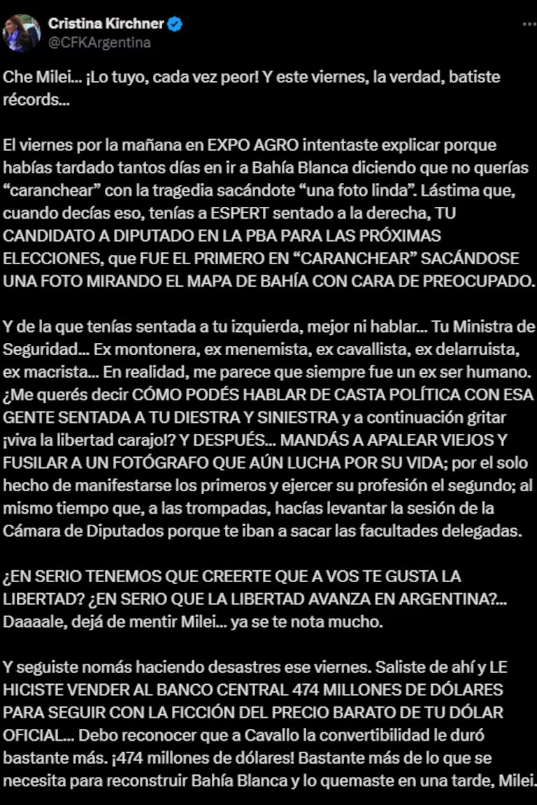 En su nueva publicación, Cristina Kirchner comenzó destacando el evento del viernes en Expoagro, en donde se presentó el mandatario. Allí, según la exvicepresidenta, Milei intentó justificar su tardanza en visitar Bahía Blanca tras una tragedia, alegando que no quería “caranchear” tomando “una foto linda”. Sin embargo, Kirchner señaló como contradictorio que a su lado estuviera su aliado José Luis Espert, “que fue el primero en ‘caranchear’ sacándose una foto mirando el mapa de Bahía con cara de preocupado”.