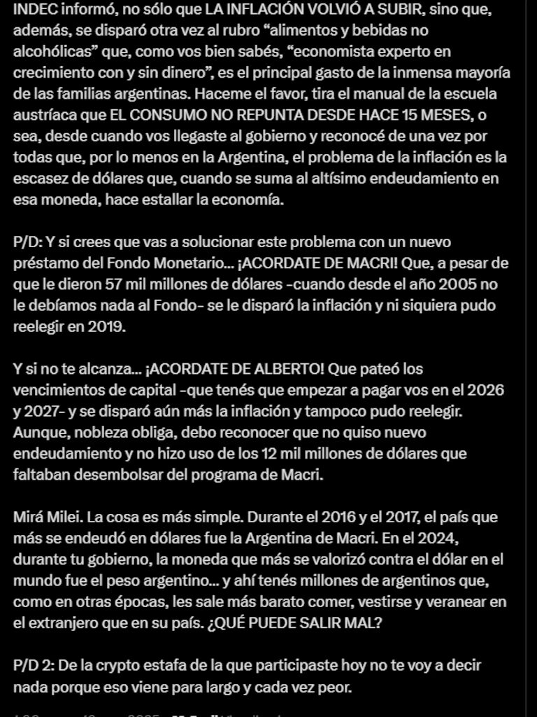 Tal como suele ocurrir, Cristina Kirchner también habló de la inflación, que en el mes de febrero registó un pequeño repunte, de acuerdo al informe del INDEC publicado ese mismo viernes. “Haceme el favor, tirá el manual de la escuela austríaca… el consumo no repunta desde hace quince meses, o sea, desde cuando vos llegaste al gobierno”, afirmó en otro de los pasajes más duros de su columna. Kirchner atribuyó la inflación a las recurrentes crisis de deuda en dólares y su impacto en la economía.