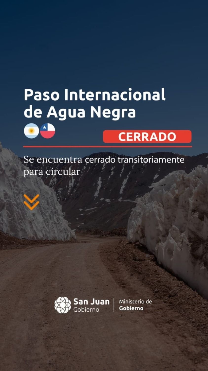 El Paso Internacional de Agua Negra fue cerrado de forma preventiva este jueves 8 de mayo desde las 18 horas debido a las condiciones climáticas adversas registradas en la zona de límite internacional.