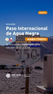 El Ministerio de Gobierno de San Juan informó el estado actualizado del Paso Internacional de Agua Negra al 13 de enero de 2026. Según precisaron desde la Secretaría de Relaciones Institucionales, el corredor fronterizo se encuentra habilitado para la circulación vehicular entre las 7:00 y las 17:00 horas, a través de la Ruta Nacional 150.