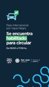 El Gobierno de San Juan informó que el Paso de Agua Negra se encuentra habilitado este 7 de abril, con circulación permitida entre las 9:00 y las 17:00 horas a través de la Ruta Nacional 150.