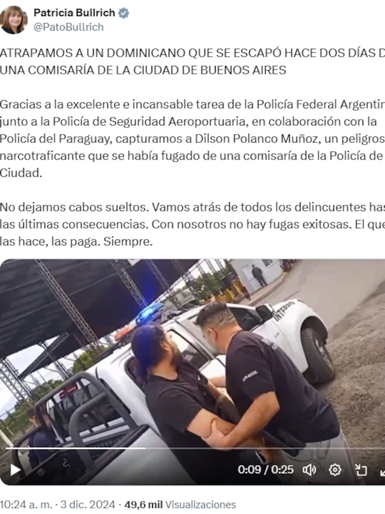 Durante una entrevista con Luis Majul por la señal de La Nación +, la titular del ministerio confió: “Estamos conformando las figuras penales para poder lograr expulsiones rápidas, ya tenemos muchas expulsiones exprés”, para luego ejemplificar con la recaptura de un delincuente dominicano que se había fugado de una comisaría de la Ciudad de Buenos Aires y había intentado escapar a Paraguay. “Ahora va a tener esa expulsión a la República Dominicana, que es donde pertenece esa persona”, adelantó sobre el destino del ex fugitivo condenado por delitos vinculados al narcotráfico, tras felicitar por medio de la red social X a la Policía Federal Argentina (PFA), la Policía de Seguridad Aeroportuaria (PSA) y la Policía de Paraguay por el trabajo en conjunto que realizaron.